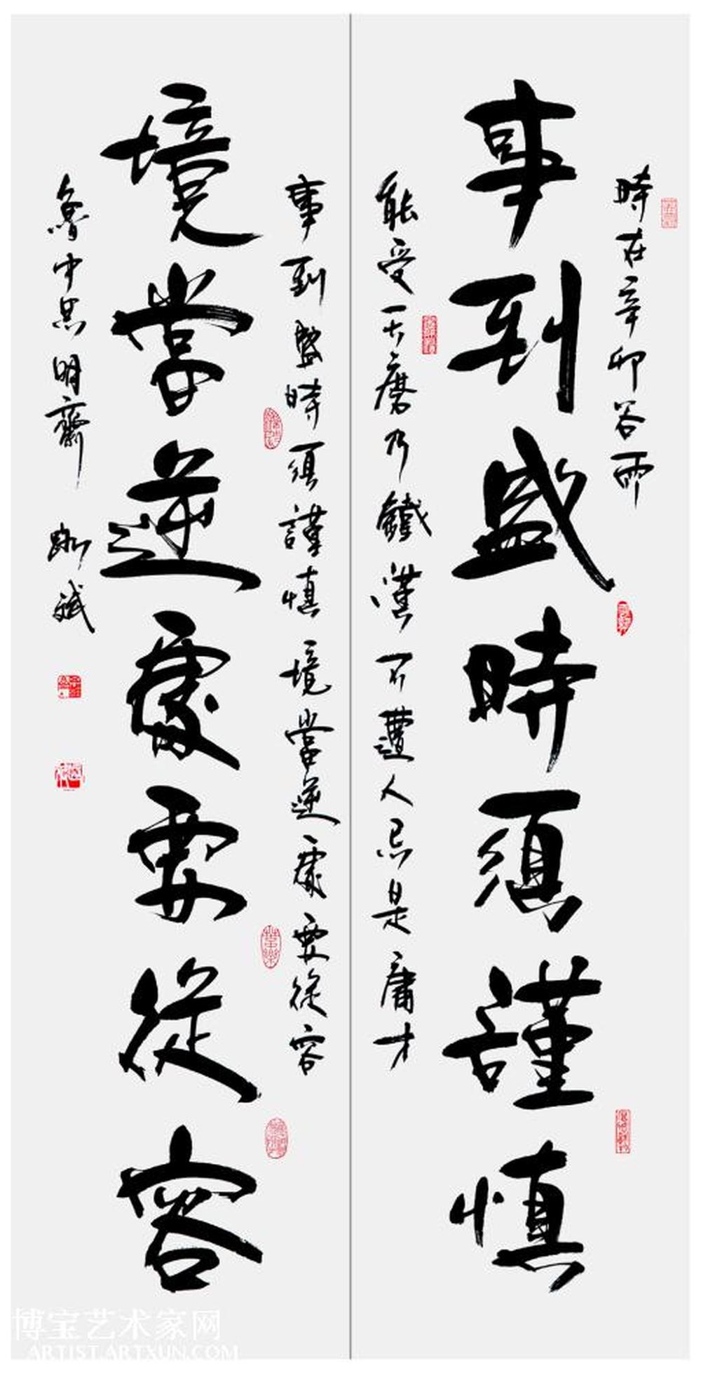 释文:事到盛时须谨慎.境当逆处要从容. 钤印:辛卯日利.云中龙.厚德载物.宁静致远.淡然.苦中乐.废纸三千犹恨少.思明斋主.路斌